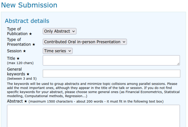 When submitting a contributed presentation (only abstract) you have to select the Type of Presentation (Contributed in-person presentation, Contributed virtual presentation or Poster Presentation (only virtual)), and then, select a session topic from the dropdown list and at least 3 keywords. The keywords will be used to group abstracts and minimize topic collisions among parallel sessions. Please add the most important ones, although they appear in the title of the talk or session. All participants can attend in-person even if they choose a virtual poster or oral presentation.